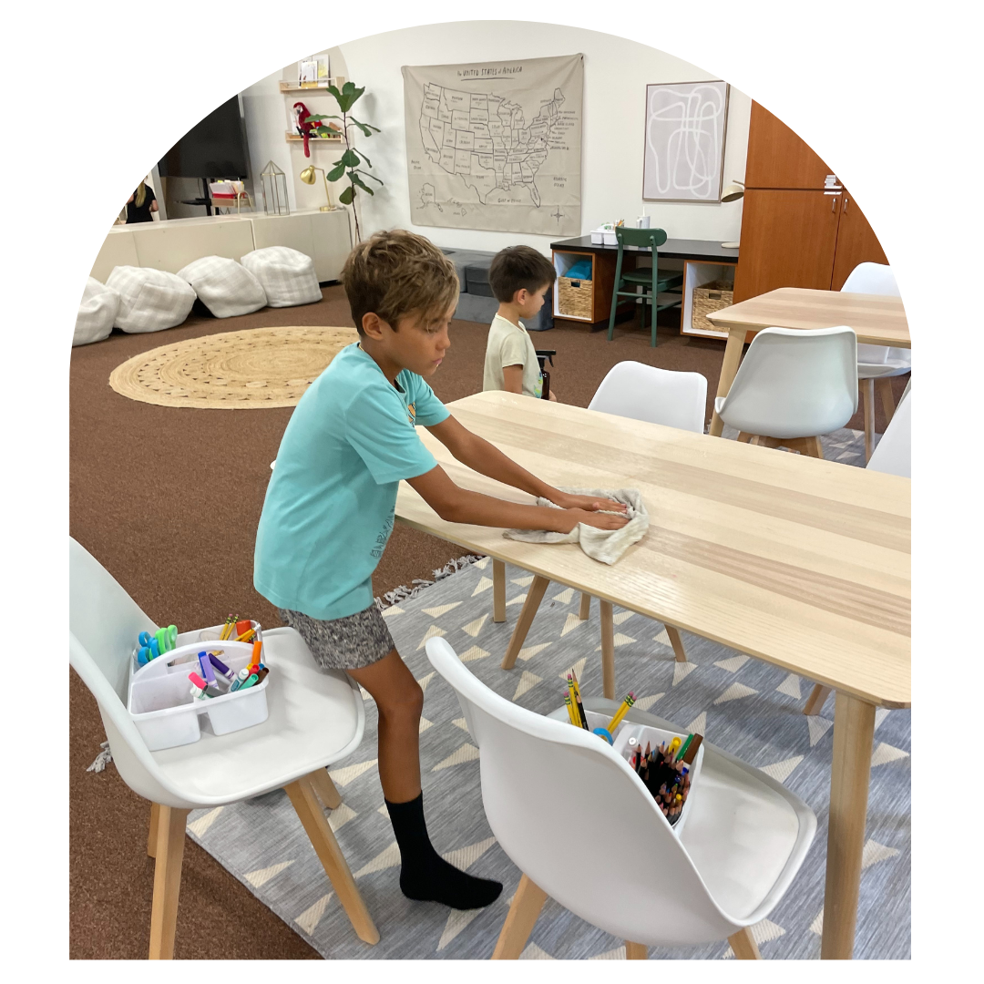 Students learn responsibility and stewardship by taking on daily studio maintenance tasks. From vacuuming and wiping down surfaces to caring for plants and sharpening pencils, every child takes ownership by playing a role in keeping our space clean and beautiful.