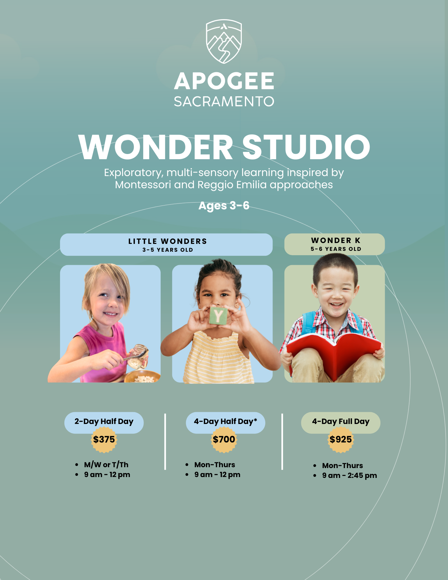 At Apogee Sacramento, we nurture children's growth academically, and also invest in their character, spiritual, and social-emotional development. Our studios offer personalized, hands-on learning that fosters belonging, freedom to learn at each student’s own pace, and the confidence that comes with gaining mastery. We prepare students for real life by blending academic knowledge with real world skills, project-based collaboration and leadership experiences.