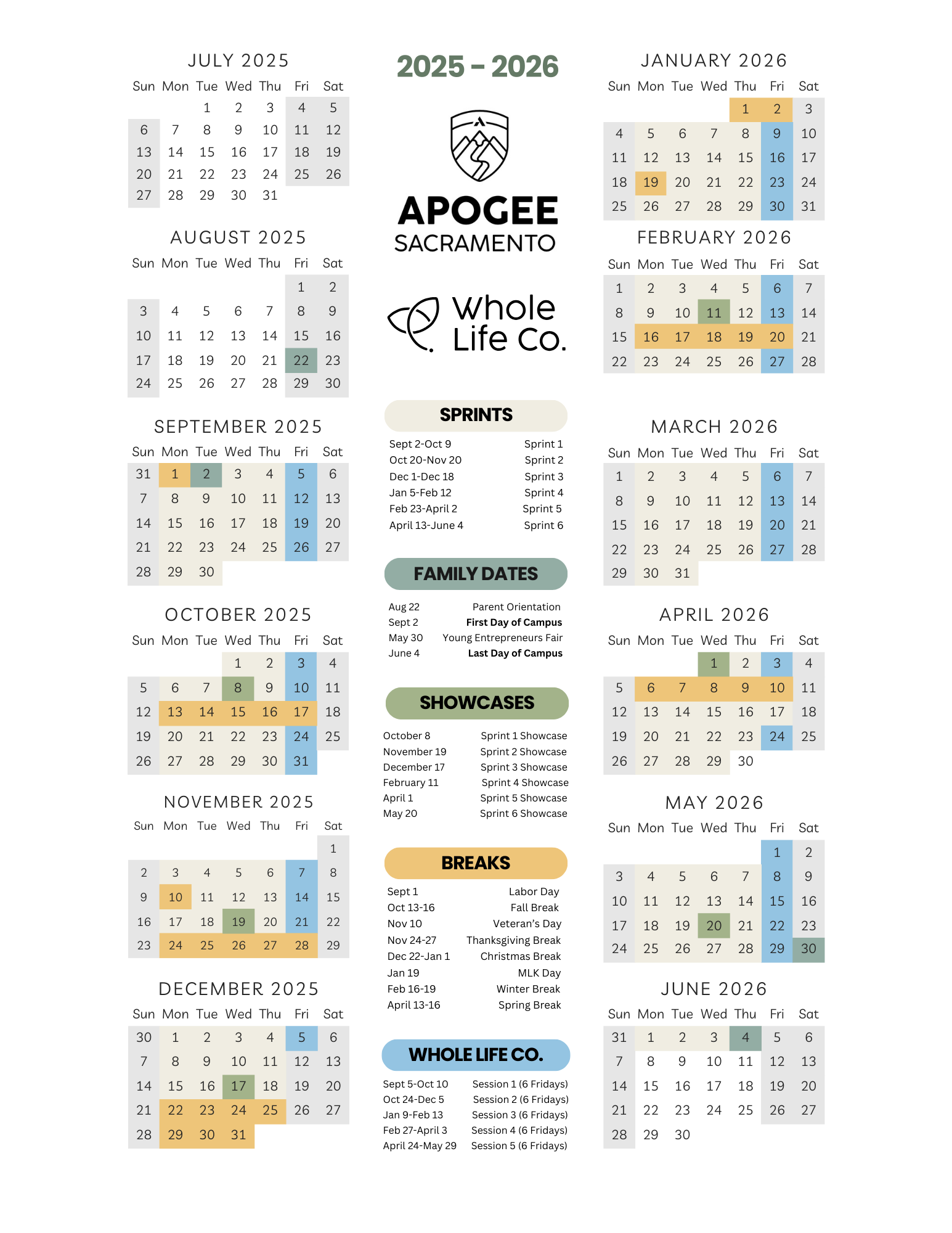 See the full list of offerings and register separately at wholelifeco.org. Apogee families receive 50% off registration.