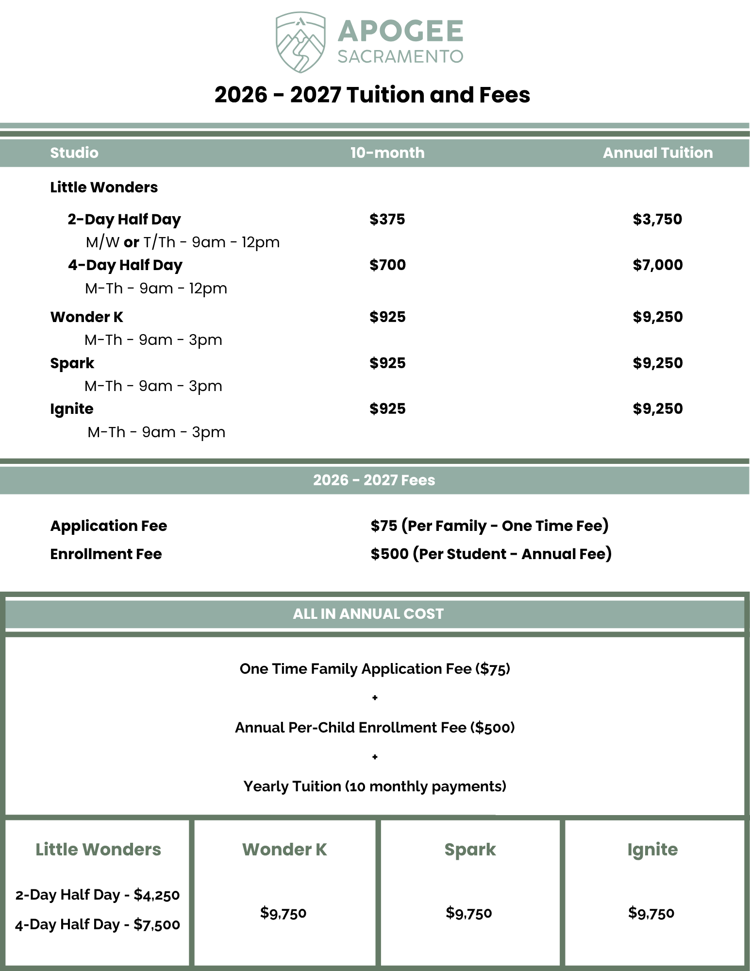 Apogee Sacramento is not just a place of learning, but an invitation to a journey of becoming. Our passionate and skilled team is committed to investing wholeheartedly in your children as they explore, learn, grow to reach their full potential, and become the leaders God has made them to be. We offer a uniquely rich experience, nurturing your children not just academically, but also in their character, social-emotional, physical, and spiritual development. We are also here to partner with, guide and support you as you lead your family with care and intentionality. Our tuition structure reflects the high-quality, personalized, hands-on learning experience we provide, and the value your family will receive being part of our vibrant community.